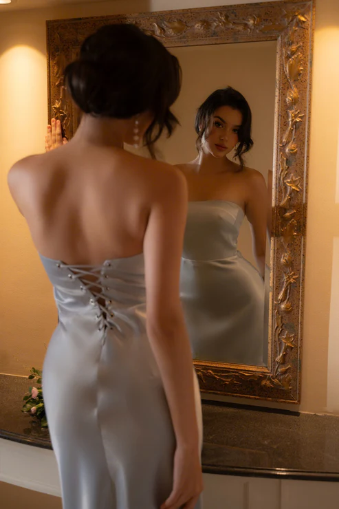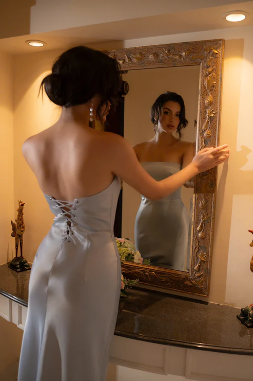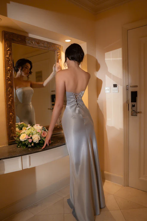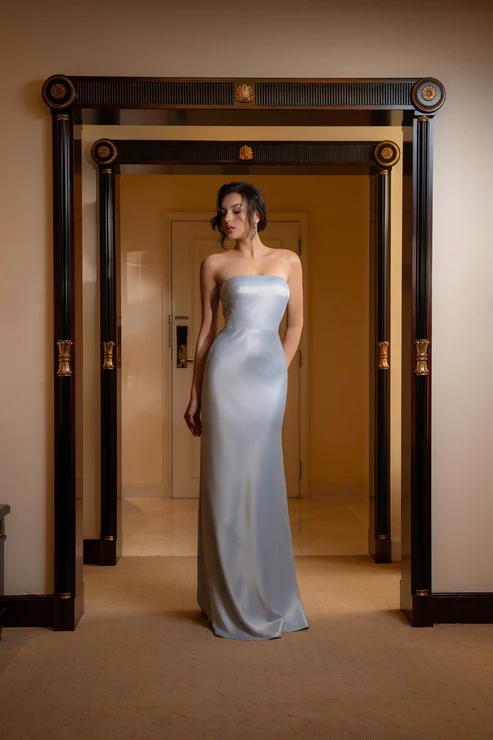Cool, confident, and undeniably captivating — the Frosted Elegance Gown wraps you in satin serenity. With its clean strapless neckline and silky sheen, this dress is for the woman who rules the room without raising her voice.
