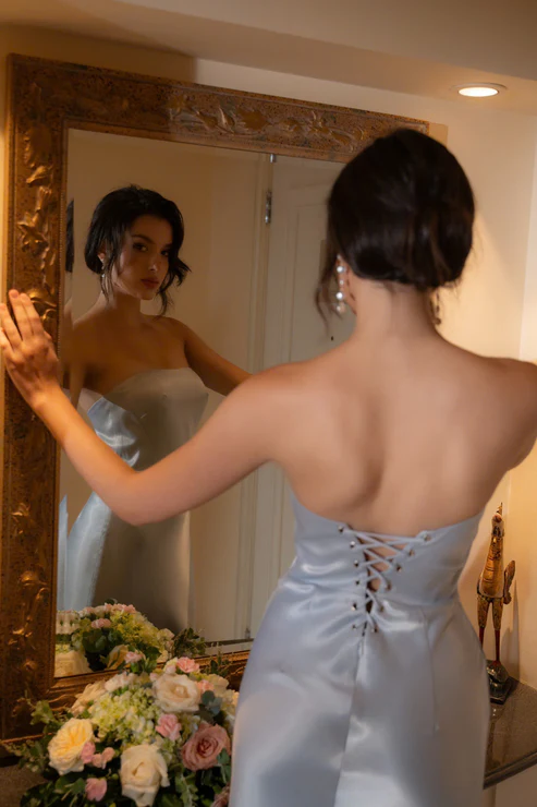 - Fabric: Smooth satin in a glacial blue hue that catches light with every graceful movement