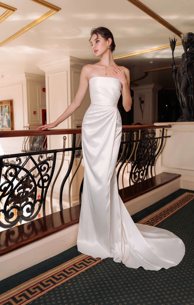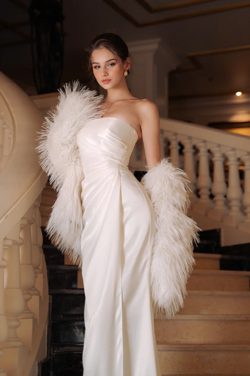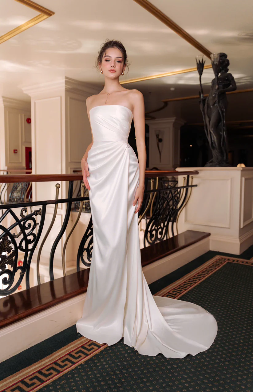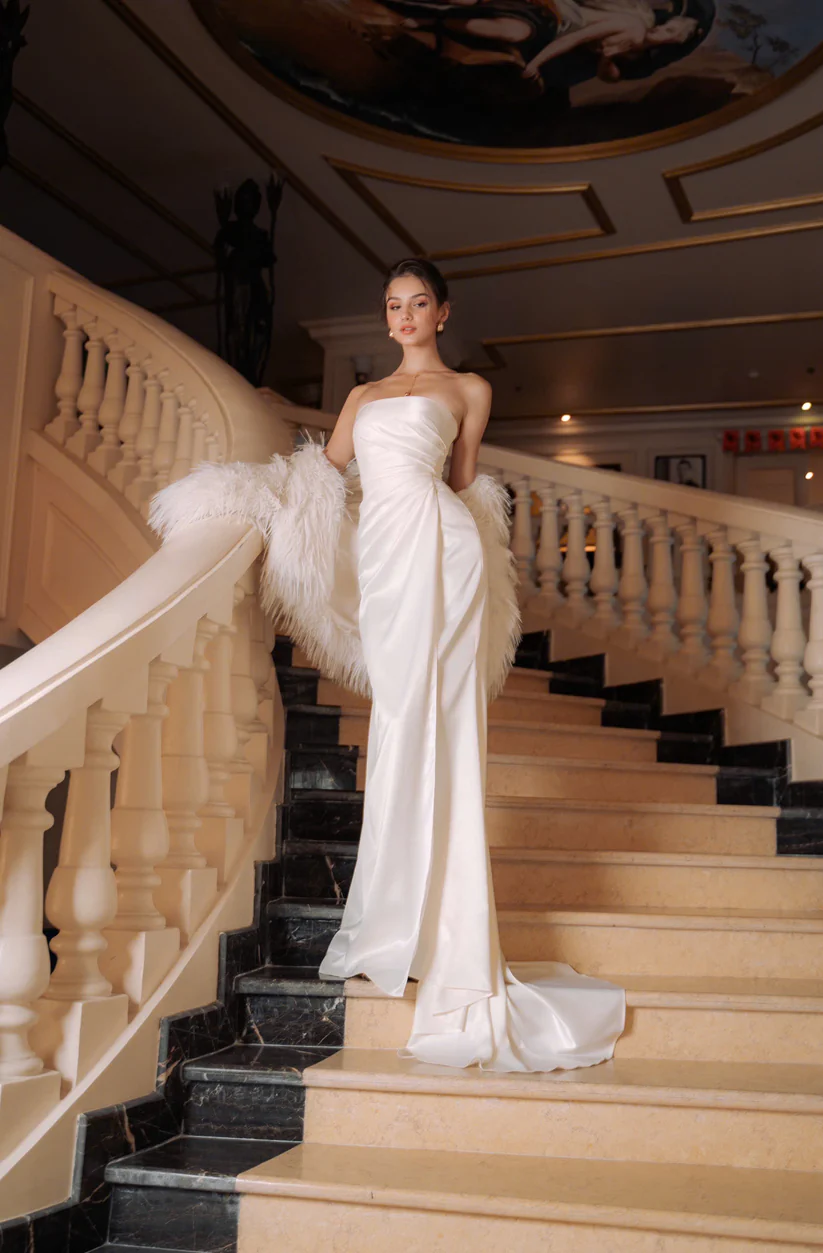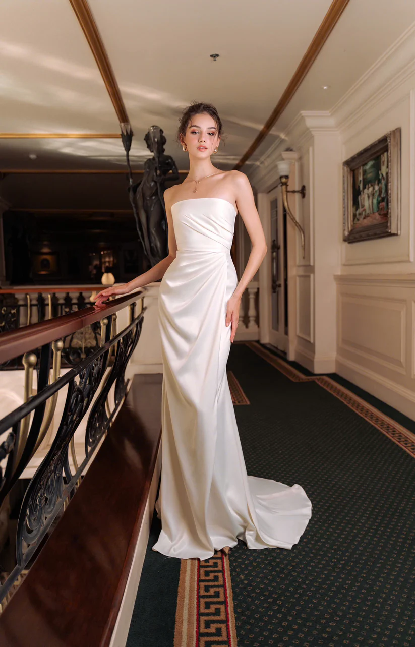 Glamour with a whisper of vintage seduction, the Opulence Drape Gown is crafted for grand entrances and stolen glances. With luxe satin folds and a sculpted strapless silhouette, it embodies timeless sophistication and modern indulgence.