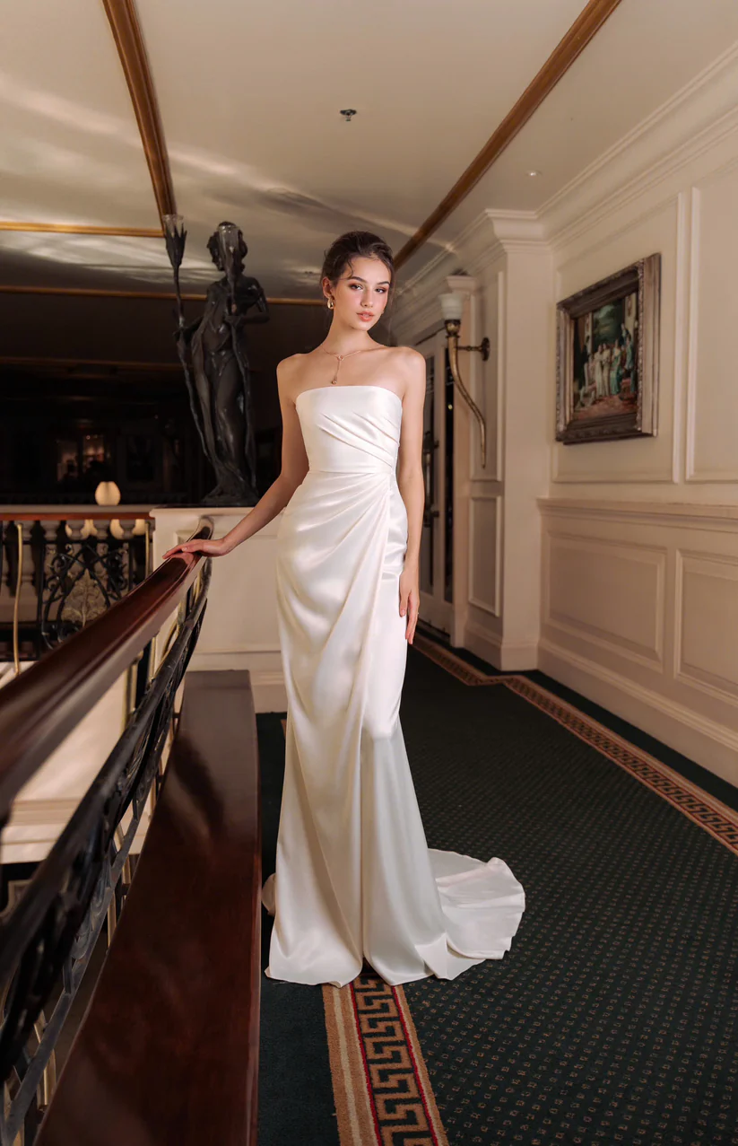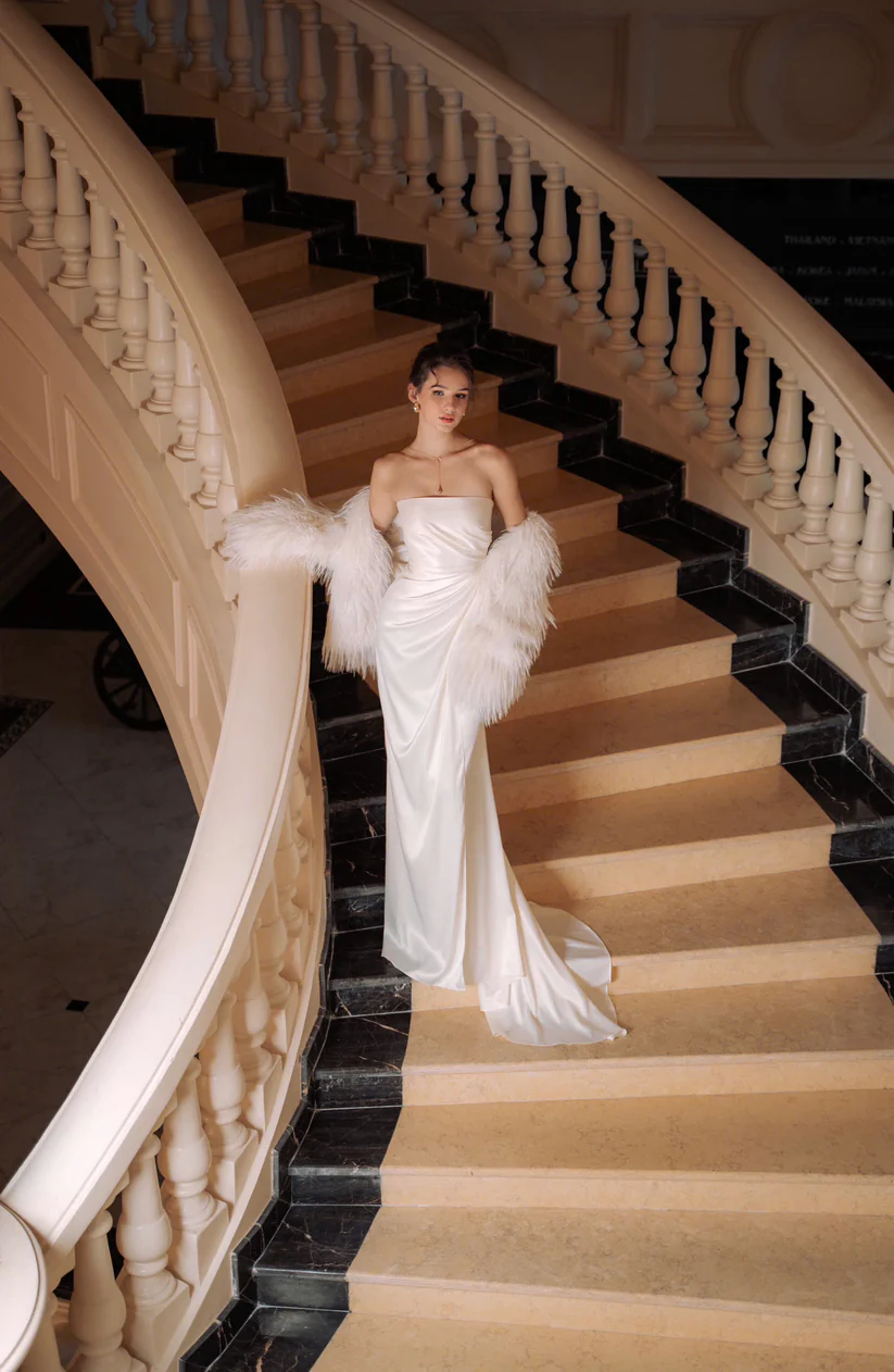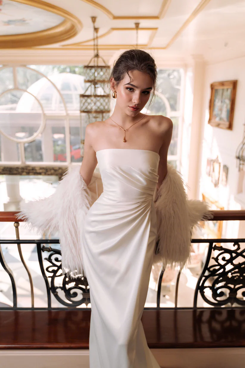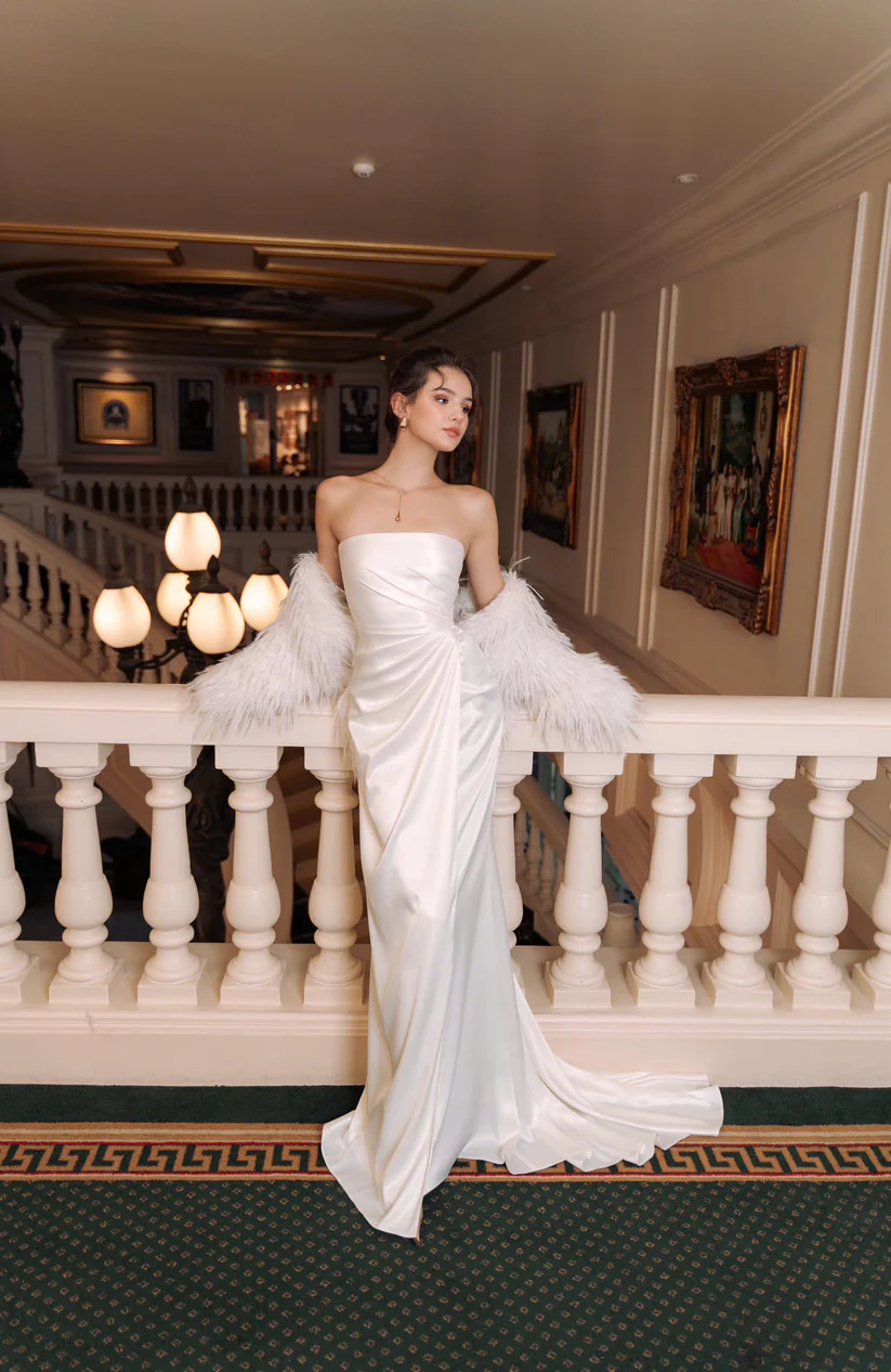 Glamour with a whisper of vintage seduction, the Opulence Drape Gown is crafted for grand entrances and stolen glances. With luxe satin folds and a sculpted strapless silhouette, it embodies timeless sophistication and modern indulgence.