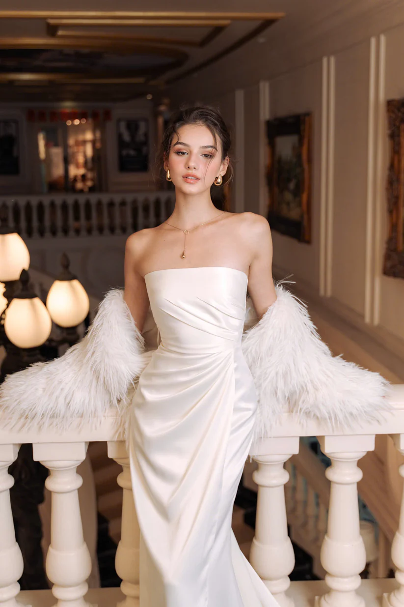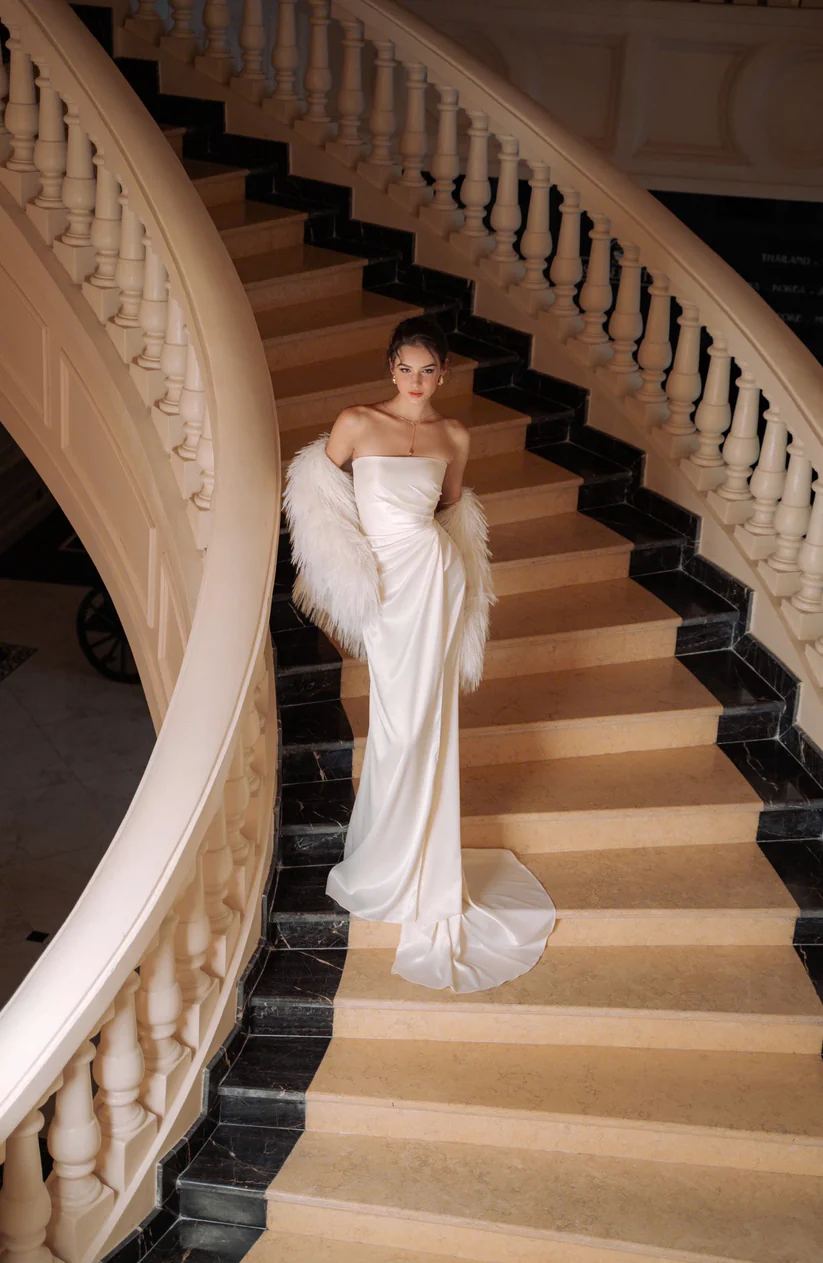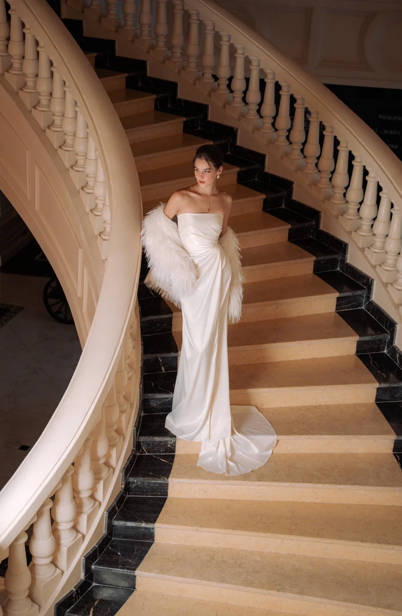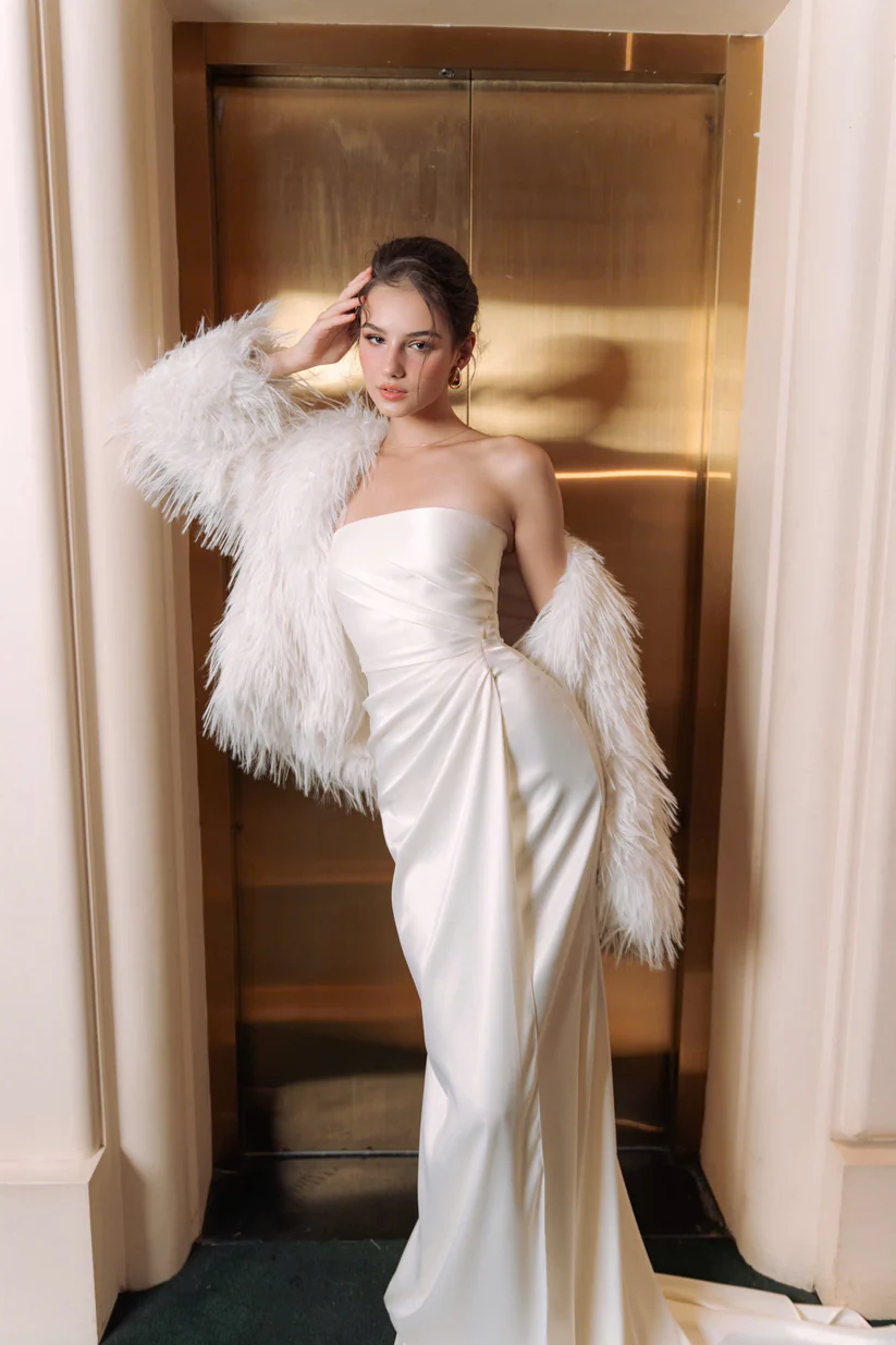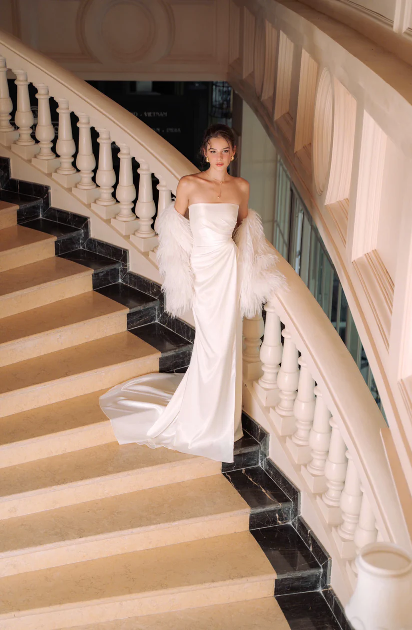Glamour with a whisper of vintage seduction, the Opulence Drape Gown is crafted for grand entrances and stolen glances. With luxe satin folds and a sculpted strapless silhouette, it embodies timeless sophistication and modern indulgence.