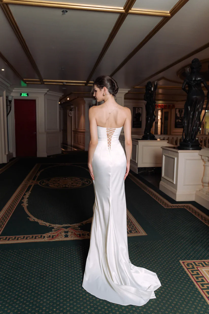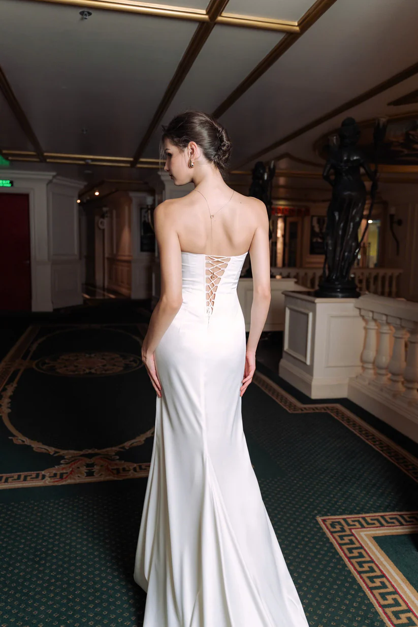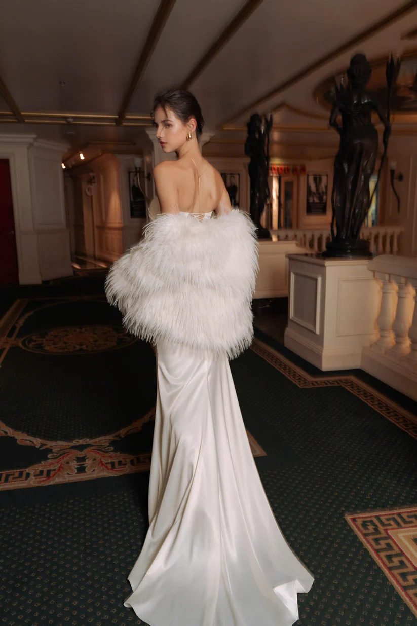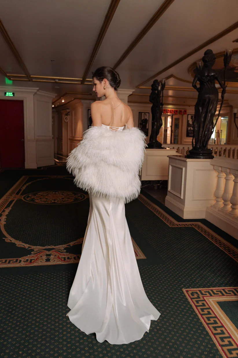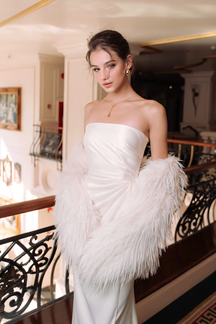 Glamour with a whisper of vintage seduction, the Opulence Drape Gown is crafted for grand entrances and stolen glances. With luxe satin folds and a sculpted strapless silhouette, it embodies timeless sophistication and modern indulgence.